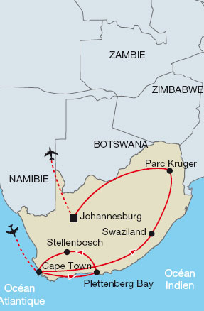Les distances entre les différentes étapes peuvent paraître longues, mais vous serez cependant récompensé par la beauté des paysages et la diversité des animaux au sein des Parcs. La visite du Cap de Bonne Espérance et sa position de « bout du monde ». Safari dans le fameux Parc Kruger à la découverte des Big Five, Johannesburg et Soweto quartier réformateur de la ségrégation sans oublier l'immensité du canyon de Blyde River.